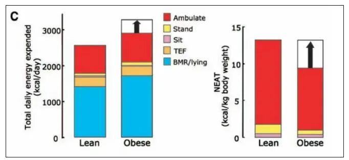 瘦人和胖人比较不同运动习惯能力消耗情况(JALevineetal,2005)注:TEF:食物热效应;NEAT:非运动活动热生成;BMR:基础代谢率