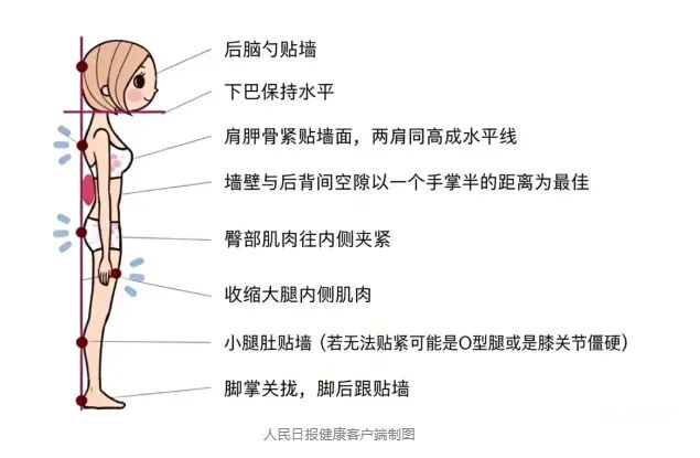 背部与胸廓整个背部贴靠墙面,后脑勺、上背部、肩胛骨、臀部四点必须贴墙,保持胸廓舒展,不含胸驼背。